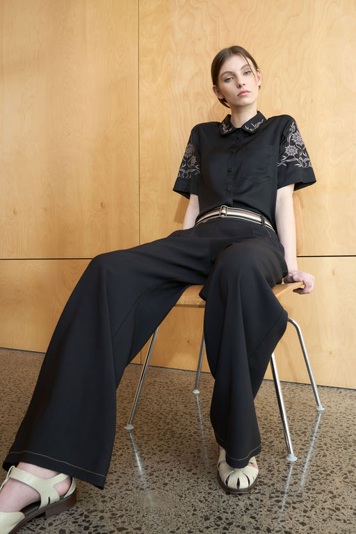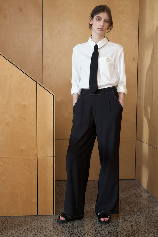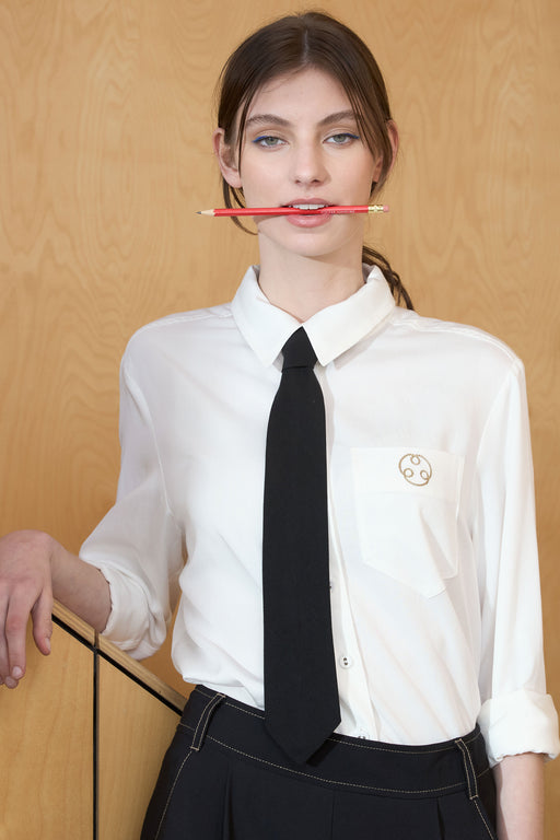Our Coco shirting and Traveller stories provide a myriad of easy, and elevated shirting options. The black tie and white shirt moment is a nod to Tom Conway and his impeccable tie styling.