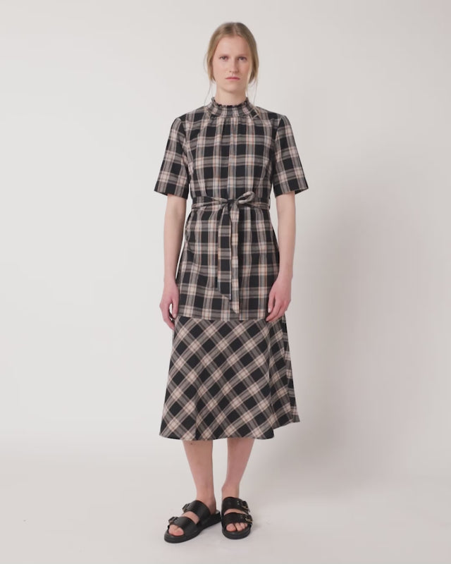 Our stylish Audrey dress will take you from café to work to dinner. It is a neat fit, midi length dress with high shirred neck. It looks great belted or unbelted and features a deep, flared bias tier in the skirt.