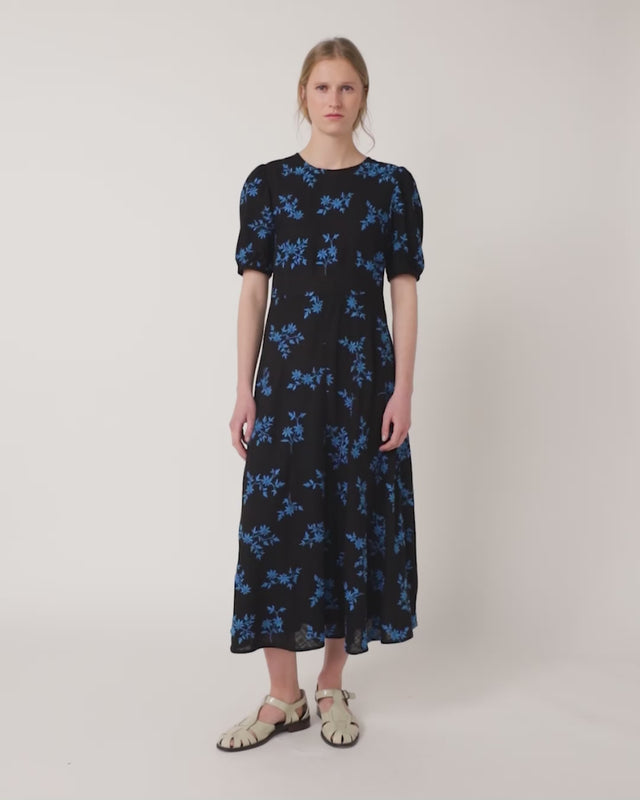 Our Blooms dress is a fully embroidered, flattering bias-cut style featuring a fitted bodice and slightly flared A-line skirt. The midi-length dress has a fixed waist, round neckline with short sleeves gathered into a bound cuff.