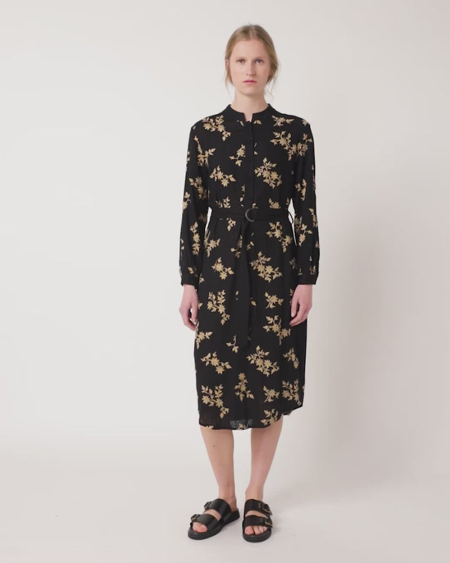 Our Blooms shirt dress is elevated with an elegant blooms embroidery. It features a collar stand and button placket through to waist. This dress is mid calf length and comes with a matching belt and sleeves that gather onto a tailored cuff. This is a dress that can effortlessly take you from café to work and then onto a dinner out.