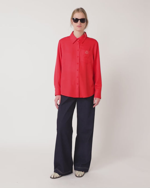 The Coco shirt by Sylvester is modern workwear made easy. Features include covered buttons throughout, a classic fold-down collar, and a singular patch pocket on the front. Our iconic Huddle embroidery adorns the pocket. Wear the sleeves down or roll them up for summer. We paired our Coco shirt here with the Denim pleat trousers and it looks fantastic with matching Coco trousers as seen in our look book.