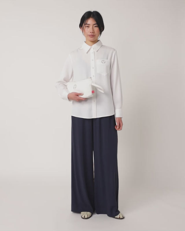 The Coco shirt by Sylvester is modern workwear made easy. Features include covered buttons throughout, a classic fold-down collar, and a singular patch pocket on the front. A subtle but strong huddle embroidery adorns the pocket. Wear the sleeves down or roll them up when necessary. We pair our Coco shirt with the Coco trousers and accessorize with the Sylvester clutch. It also looks summer fresh with our Workwear skirt.