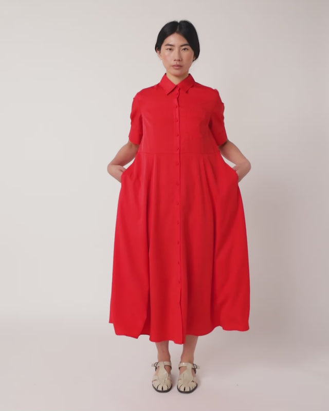The Coco dress is a classic shirt dress style in an easy fit with billowy midi-length skirt complete with pockets. It has a classic shirt collar and cuffs with covered buttons. The matching belt is beautifully plaited and removable so you can wear this dress belted or unbelted.