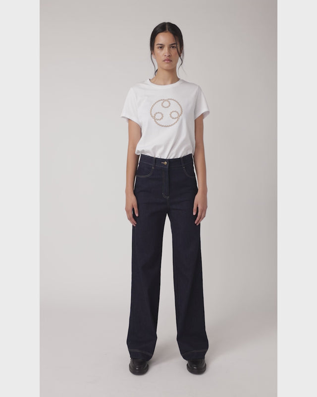 The Denim trouser by Sylvester has a subtle flare and features a flattering high-waistline and contrast stitching. Wear yours with our signature Huddle t shirt or layer up with our Dimity shirt and Flannel jacket.