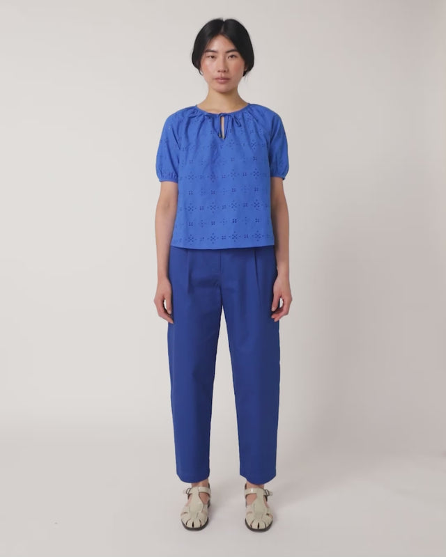 Our Diamond top is a versatile, spring essential. Made from 100% cotton, it's an easy fit. It features a wide round neck and elbow-length raglan sleeves. The neck opening closes with self ties. Wear our Diamond top with our Workwear barrel pants to complete the look.