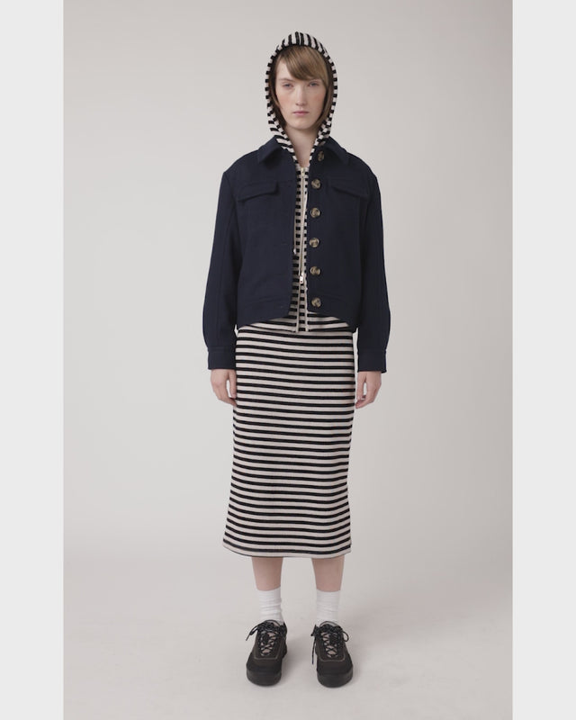 Our Flannel jacket is a boxy-cut style featuring oversized tortoiseshell buttons, a classic fold-down collar, and two front pockets at the bust. It is fully lined. Styled here with our Stripey hoodie and Stripey skirt, or pair with the matching Flannel skirt for a fantastic winter suit.
