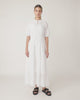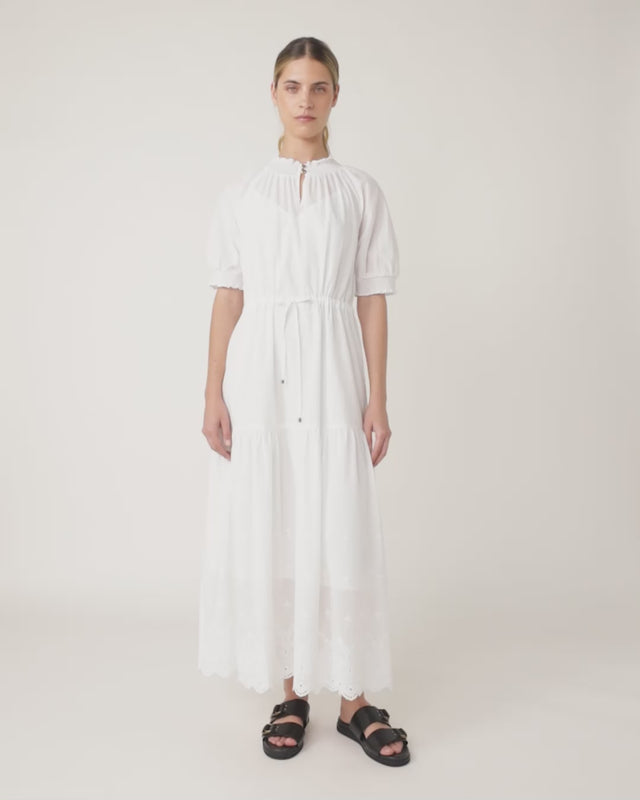 The Florentine midi dress is an incredibly flattering, easy-fit dress. It features a high shirred neck, which opens at the front with two metal buttons. The elbow length sleeves gather into shirring, and you can adjust fit at the waist with a self drawstring. Intricate embroidered lace completes the dress. Pair with sandals or heels.