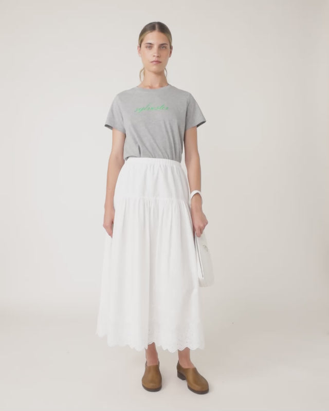 The Florentine skirt is an easy-fit skirt made from 100% cotton. Designed to sit at the low calf, it features a gathered tier in the skirt and embroidered lace at the hem. Pair your skirt with the Sylvester script t-shirt, and accessorize with the Clutch bag.