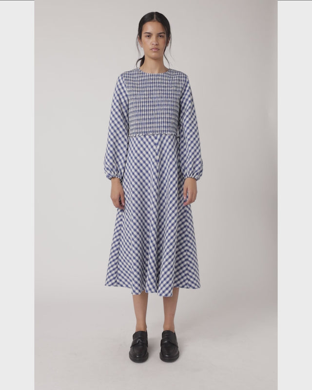 Our Gingham dress features a very flattering shirred bodice with a round neck, bias cut full sleeves gathered into an elasticated cuff and a gently flaring, mid-calf bias cut skirt. Pair with our Slouch bag and loafers to go anywhere.