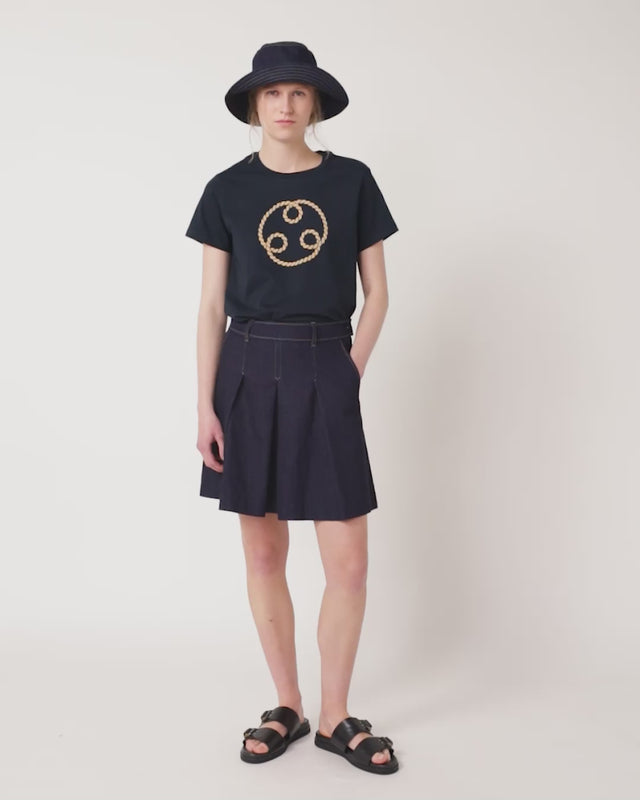The Huddle is the Sylvester brand logo - a circle of rope featuring 3 loops representing the boys' heads together in a huddle. Wear this classic, easy fit t-shirt with our Denim pleat skirt. We also love the lookbook styling, layered with our Traveller shirt, Denim walk shorts and Stripe belt.