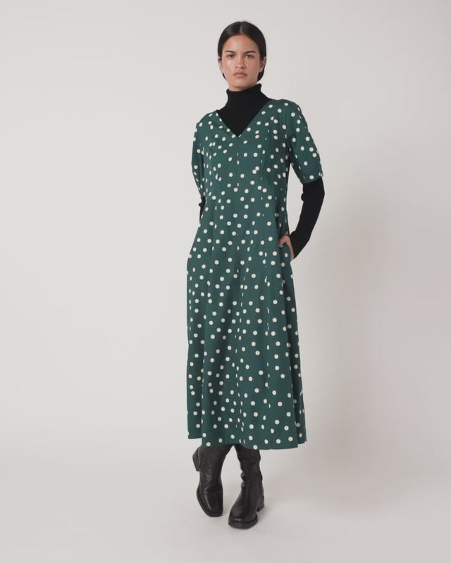 The Infinity dress is very flattering, featuring paneled bust and waist shaping and a gently flared skirt to mid calf. Ever practical, it's hand washable and features pockets. Dress up with heels or get cozy with boots and our merino Skinny rib.