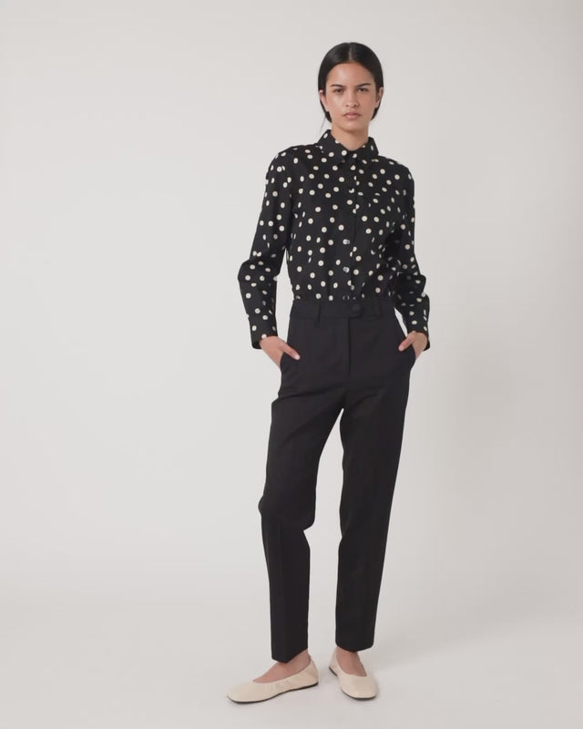 Our Infinity shirt is an easy fit, button through style with a unique gathered yoke across the back so you can customize the fit. This shirt pairs beautifully with the Twill cigarette pants as worn here. Equally, it looks great worn untucked, as worn with our Ripple skirt.