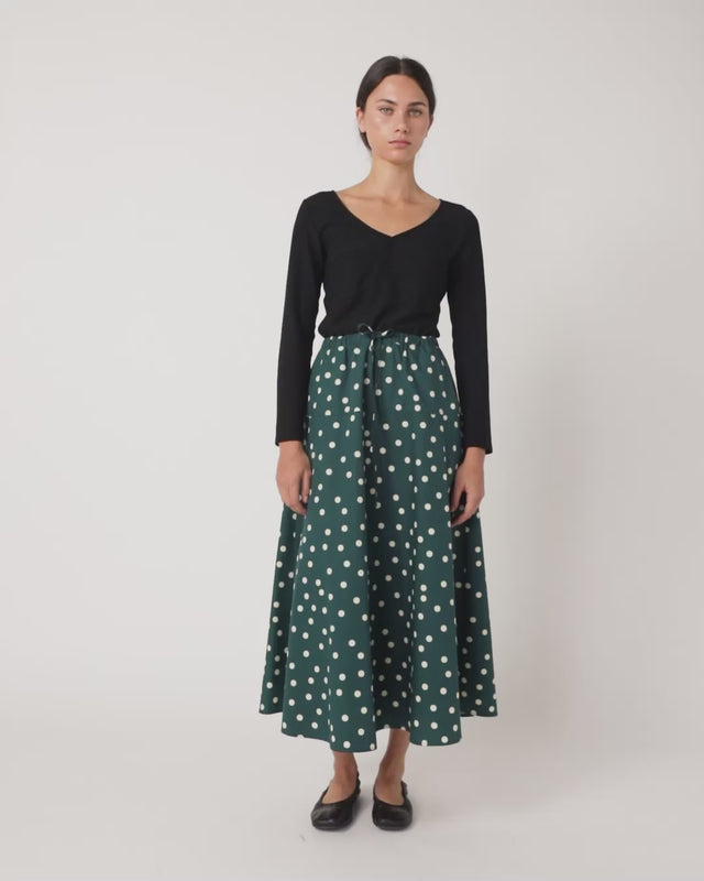 Our Infinity skirt features an adjustable elasticated, drawstring waist and handy pockets. The flared skirt drops off a yoke to low calf. Worn here with flats, and our Ripple top.