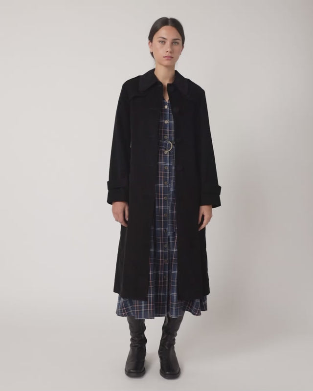 Our Kubrick cord coat is fully tailored and lined. This piece will take you for a country weekend or to the head office. Its beautiful detailing includes covered buttons and belt buckle, epaulettes and cuff straps, and buttoned down yokes. We've styled it here with our Plaid dress or wear it over anything in your wardrobe.