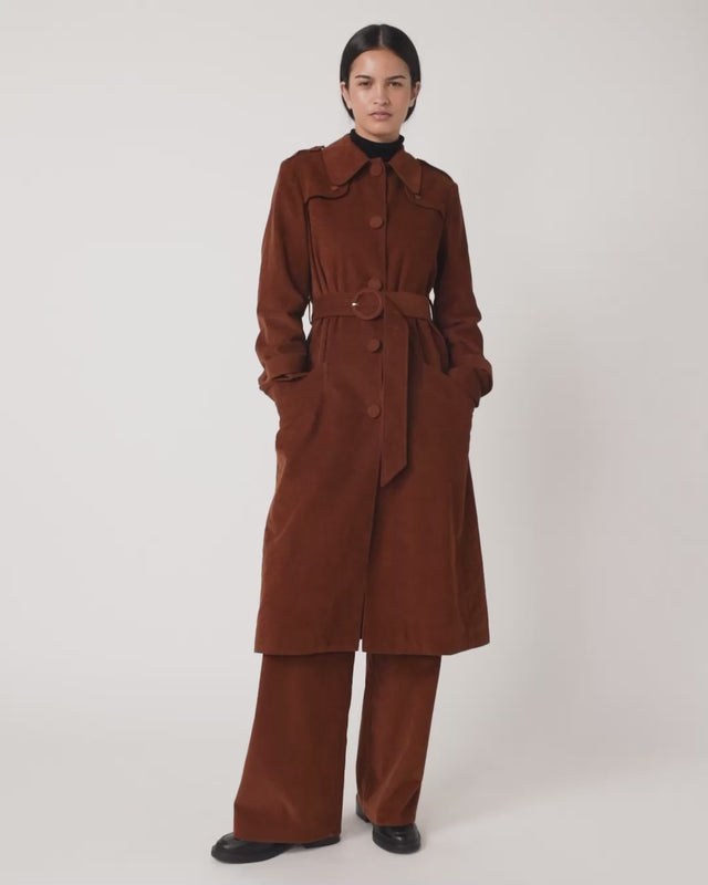Our Kubrick cord coat is fully tailored and lined. This piece will take you for a country weekend or into the office. Its beautiful detailing includes covered buttons and belt buckle, epaulettes and cuff straps and buttoned down yokes. Wear with our merino Skinny rib and matching Kubrick cord trousers or throw over anything in your wardrobe. We love it with the Ripple pleat skirt.