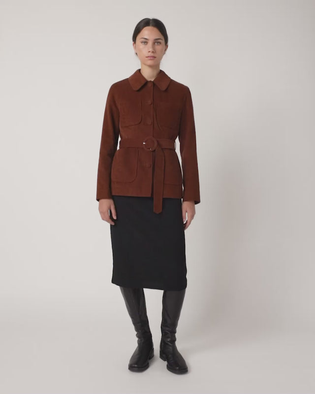 Our stylish Kubrick cord jacket will complete any outfit. It is an easy fit for layering but has flattering shaping through the waist. It features a classic fold-down collar, covered buttons and belt buckle and four patch pockets. It looks great buttoned and belted or worn open. Worn here with our Ripple dress.