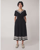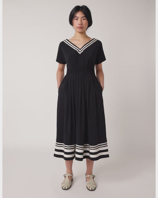 The Marianne dress is very feminine and beautifully detailed. It is an easy fit with flattering shirring through the waist, cap sleeves, and side pockets. It features a wide V-neck front and back with fine crossed straps across the V back. Beautiful contrast ribbon stripes at the neck and hem complete this dress. Throw our Workwear jacket over it for cooler evenings.