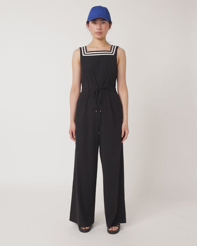 Our Marianne jumpsuit is great for weekends or parties. It's an easy fit with full-length wide legs, an adjustable drawstring waist, and always useful pockets. Our jumpsuit is finished with bold contrast stripes around the neck. Complete the look with our Workwear cap.