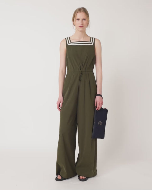 Our Marianne jumpsuit is great for weekends or parties. It's an easy fit with full length wide legs, an adjustable drawstring waist, and always useful pockets. Our jumpsuit is finished with bold contrast stripes around the neck. Style it with our Denim summer jacket or Denim cap.