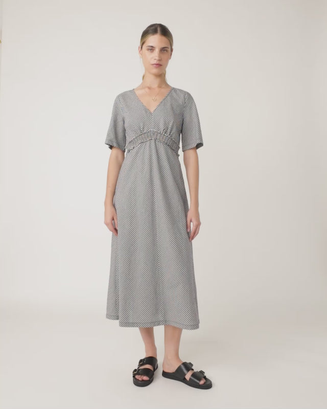 Our Mini check dress is a do-it-all summer dress. Made from 100% cotton, it features a shirred band through the waist, a slight flare in the sleeve, and an invisible zip on the side. We pair our Mini check dress with the blue bucket hat and sandals.