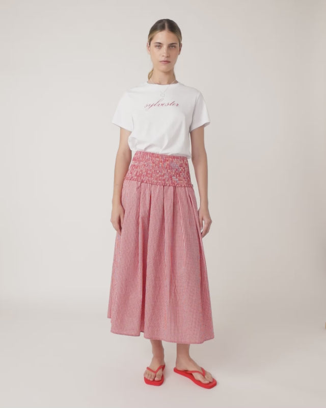 The Mini check skirt is an easy-fit skirt made from 100% cotton. Features include a deep shirred yoke, soft pleats, and gathers. The Mini check skirt can also be worn around the bust to create a gorgeous summer dress. Pair your Mini check skirt with the Sylvester script t-shirt to complete the look.
