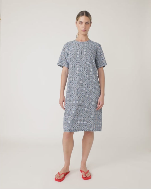Our Mosaic shift dress is a relaxed fit dress perfect for long summer days. Featuring a bound round neck, rear button closure, elbow length sleeves, and a removable tie belt in matching fabric. Style with the Kiki sunglasses.