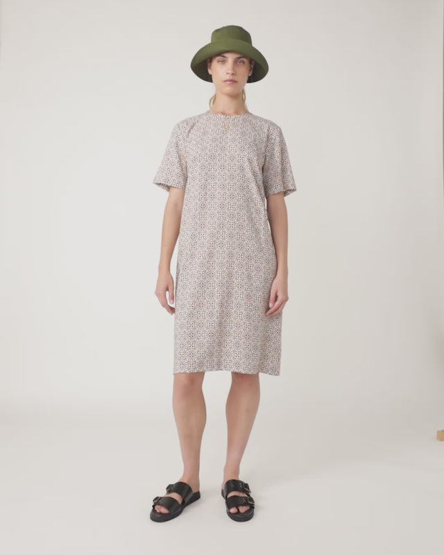 Our Mosaic shift dress is a relaxed fit dress perfect for long summer days. Featuring a bound round neck, rear button closure, elbow length sleeves, and a removable tie belt in matching fabric. Style with our Workwear bucket hat or Stripe belt.