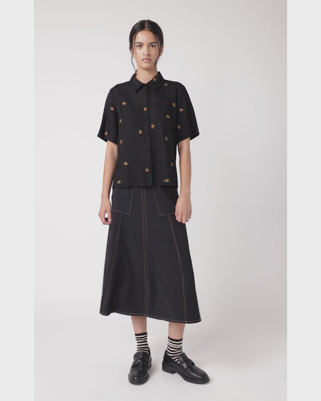 Our Pansy shirt is a classic boxy cut featuring a fold-down collar, wide elbow-length sleeves, and covered buttons. Layer up with our Skinny rib and Traveller skirt as worn here.