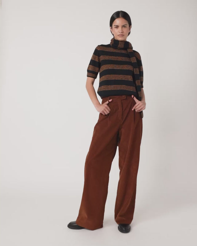 The Riley top is knitted in fluffy yarn and features stripes and ribbing at the neck, hem, and cuffs. Worn here with the matching Riley scarf and our Kubrick trousers.