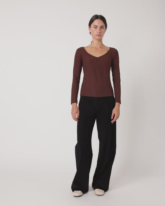 Our Ripple top is shaped through the waist, has a V-neck and features panel detailing at the bust to create a very flattering style. This is a great layering piece to add to your wardrobe. Wear with the matching Ripple pleat skirt or Kubrick cord trousers.