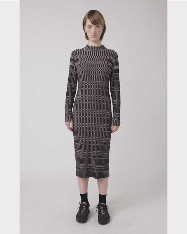 Our Rothko dress is high calf length and crafted in a cozy ribbed knit with a graphic check design. Featuring a turtle neck and long-sleeved, this semi-fitted style looks great layered under our Utility coat.