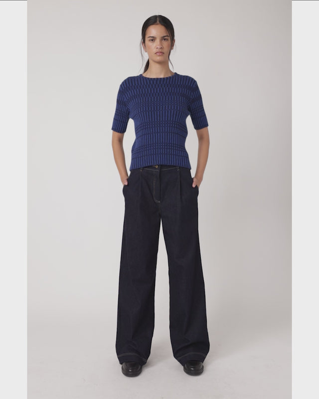 The Rothko top is a cozy ribbed knit ideal for winter layering. Featuring a graphic checked design, it has elbow-length sleeves and a round neckline. Style with our Denim pleat trousers to complete the look.
