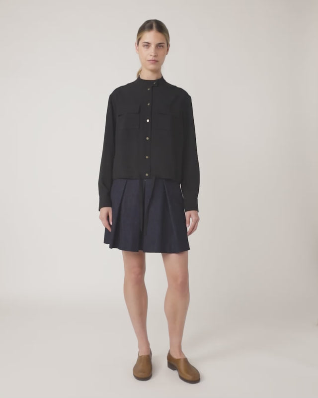 The Ruched blouson by Sylvester is an easy fit top with patch pockets on the front and long sleeves with a button cuff. Use the self-drawstring through the hem to adjust the fit and style your way. Pair with our Denim pleat skirt to complete the look.