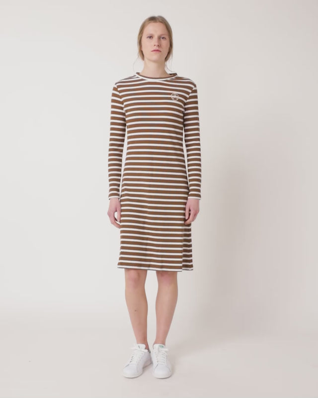 The Sailor stripe dress is neat fitting pull on style. It has a round neck, long sleeves and a subtle A-line skirt to the knee.