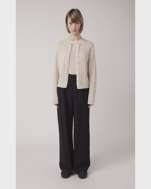 Our Scallop cardigan is a classic Sylvester shape featuring a round neck, charming covered buttons, and rib at the neck, cuffs, and hem. Worn here with our Scallop top as a twinset with the Traveller trousers, it also looks great with our Checkers shirt dress.