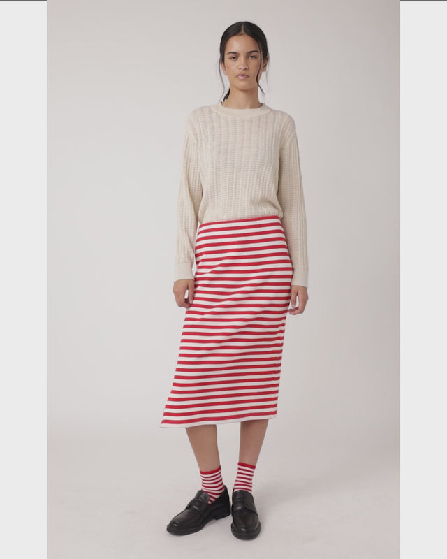 Our Scallop jumper is a slouchy fit crafted in an intricate scallop stitch. Featuring a crew neckline with ribbed detailing at the cuff, hem and neck, this long sleeved style is worn here with our Stripey skirt.