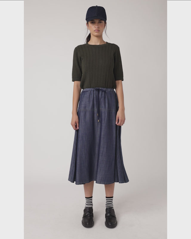 The Scallop top is an effortless transeasonal style crafted in an intricate scallop stitch. Featuring a round neck with ribbed detailing at the cuff, neckline and hem, it pairs with our Traveller skirt and ballet flats or trainers.