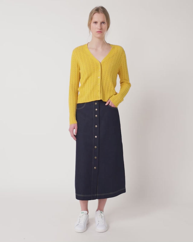 Our Shell cardigan is transeasonal knitwear at its core. Featuring an intricate shell knit stitch, it's a neat fit with a V-neck, button through front and fine rib at the cuffs and hem. We suggest styling your Shell cardigan with our Denim dome skirt.