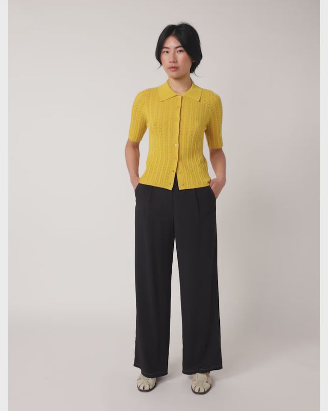 The Shell polo is a super cute knitted polo for spring. Featuring a soft roll collar, button through front, and elbow length sleeves. With an intricate shell stitch, this top is great for weekends or work days. We pair our polo with the Traveller pants and Sister bag or throw it on with our Denim walk shorts.