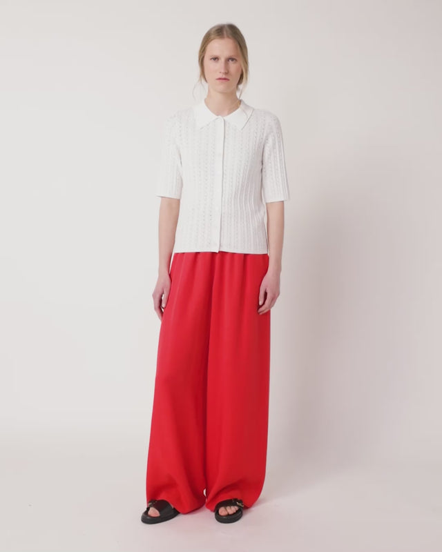 The Shell polo is a super cute knitted polo for spring. Featuring a soft roll collar, button through front, and elbow length sleeves. With an intricate shell stitch, this top is great for weekends or work days. We pair our polo with the Coco trousers for contrast and comfort.