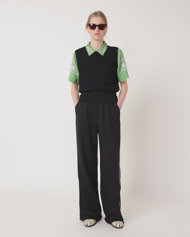 The Sylvester Shell vest can be layered on colder days or worn on its own when the sun is beaming. Featuring an intricate shell knit stitch, ribbed neck and arm holes, this vest is a super easy fit. Pair with our Trackie pants and layer over the Nova shirt to complete the look or keep it simple with our Workwear trousers.