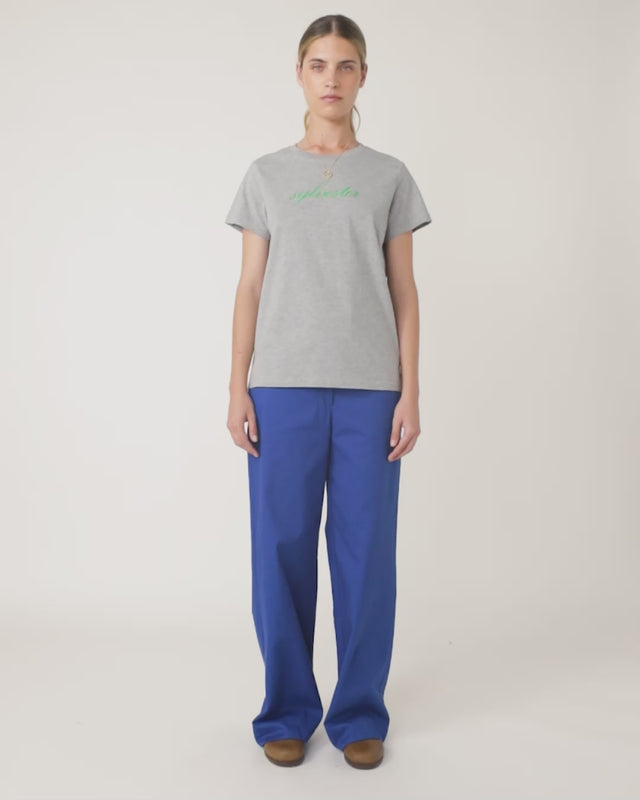 The Sylvester script t-shirt features a custom screenprint on the front in our classic t-shirt shape. Pair your Script t-shirt with the Workwear wide leg trousers.