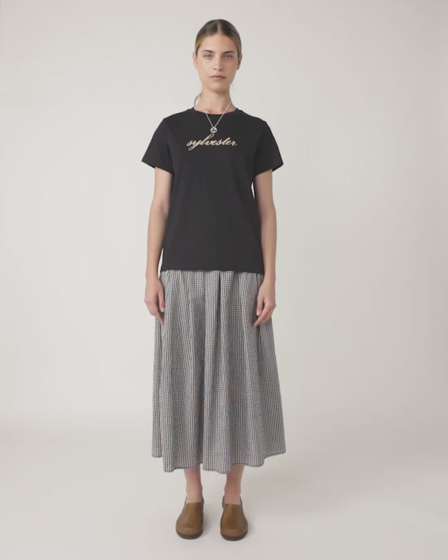The Sylvester script t-shirt features a custom screenprint on the front in our classic t-shirt shape. Pair your Script t-shirt with the Mini check skirt and Denim cap.