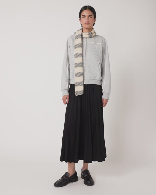 Our Trackie jacket is our unique take on track suiting. It is an easy fit, so size down for a neater fit or size up to go super slouchy. The jacket has a funnel neck and useful front pockets. It features our Huddle logo on the chest and rope piping through panels across the front and back. Worn here with our Ripple skirt or pair up with our Trackie pants for ultimate comfort..