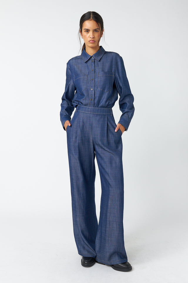 The Traveller shirt by Sylvester is an effortless button-through style featuring a classic fold-down collar and two patch pockets. This relaxed-fitting shirt pairs well with the matching Traveller trouser for a coordinated look or as worn here with our Workwear barrel pant.