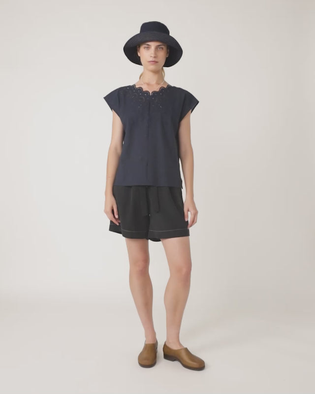 Our Traveller shorts are essential summer bottoms. Featuring a soft internal belt for easy adjustment, decorative oversized metal eyelets, and contrast racing stripes down the sides. Pair with the Florentine top and denim bucket hat to complete the look.