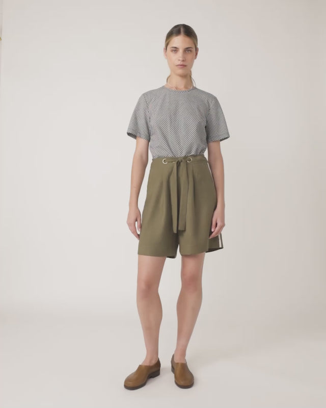 Our Traveller shorts are essential summer bottoms. Featuring a soft internal belt for easy adjustment, decorative oversized metal eyelets, and contrast racing stripes down the sides. Pair with the Mini check top to complete the look.