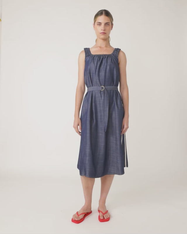 A new shape in our Traveller story, the Traveller trapeze dress is an easy fit A-line dress. Features include two contrast racing stripes down the sides, a low neck and back, and elastic through the neck and arm holes, creating a soft gather detail. Use the optional belt to style it your way. Accessorize with the Clutch bag.