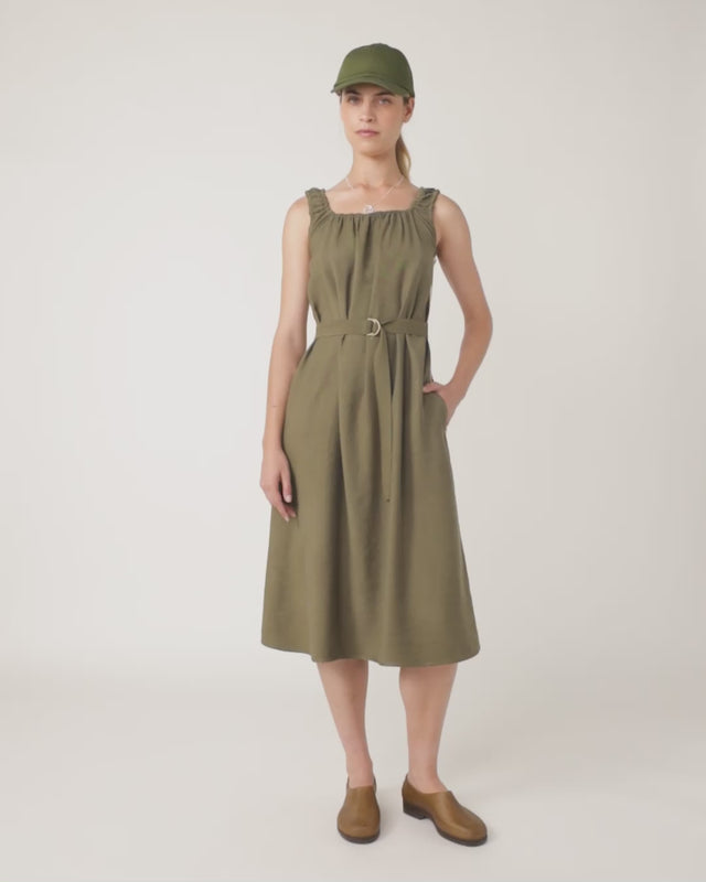 A new shape in our Traveller story, the Traveller trapeze dress is an easy fit A-line dress. Features include two contrast racing stripes down the sides, a low neck and back, and elastic through the neck and arm holes, which create a soft gather detail. Use the optional belt to style it your way. To complete the look, pair with the Workwear cap in green.