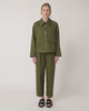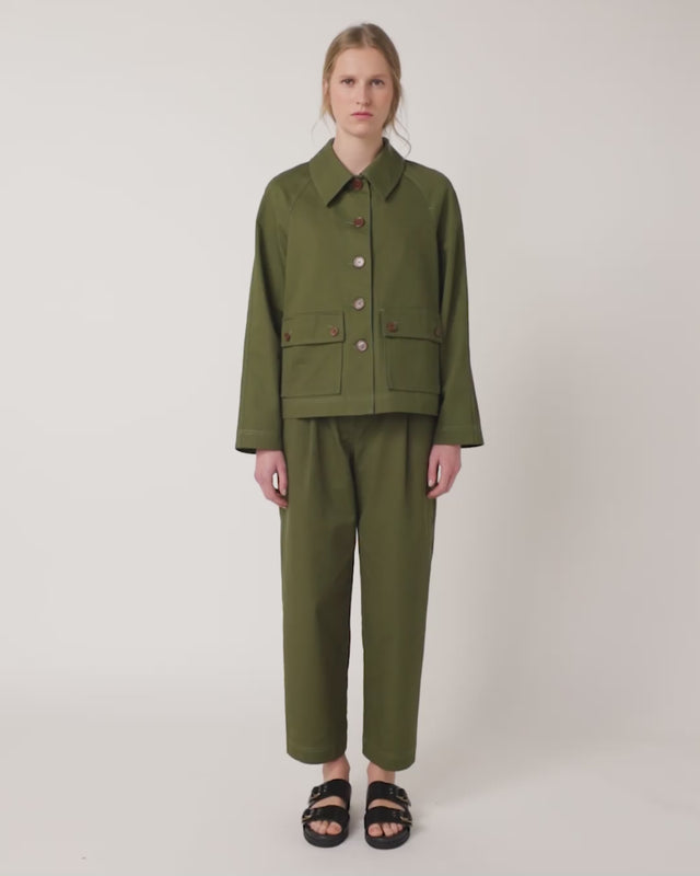 The Sylvester Workwear jacket is an easy fit, utilitarian style. It features a classic fold down collar, raglan sleeve, and contrast brown buttons through the front and on the pockets. It can also be adjusted at the back with tabs. Style it back with our Workwear barrel pant as seen here, or the Workwear skirt. and cap. We also love it with the Marianne top and Denim walk shorts or throw it over the Blooms maxi.